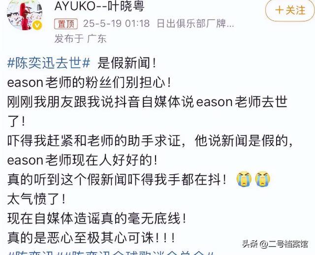 很快越来越多的人都以为陈先生真的去世了,转发的人越来越多,好在,一位名叫叶晓粤的歌手及时出来进行了辟谣,