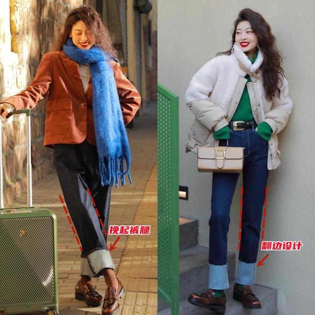 这一折的效果是双重的,它把裤子长度调整到了最佳位置,同时翻折出来的裤边会形成一个小色差,比如深色牛仔翻过来露出浅色内衬,你脚踝附近多了一层颜色变化,下半身的搭配细节感和层次感都有了。