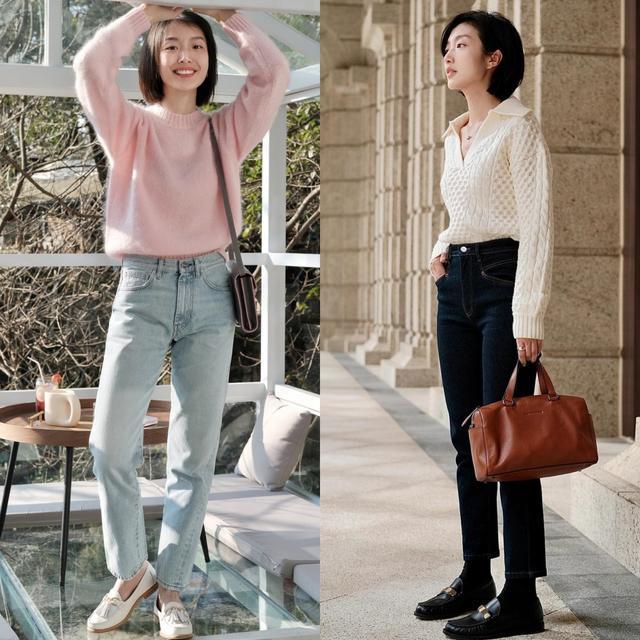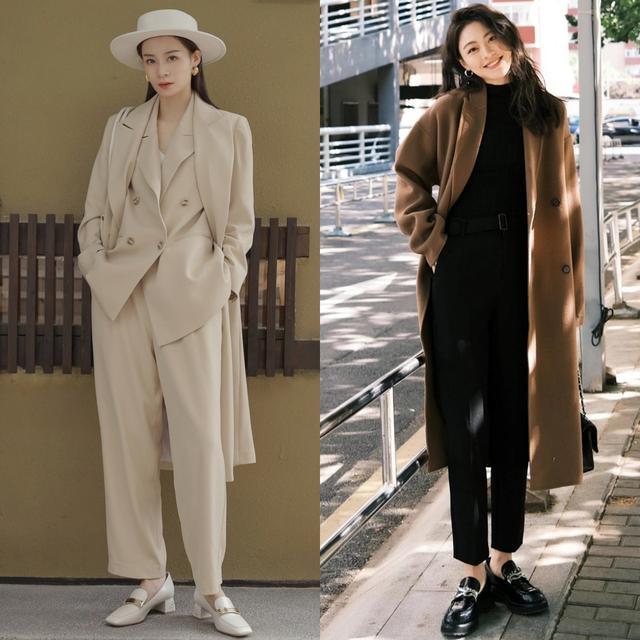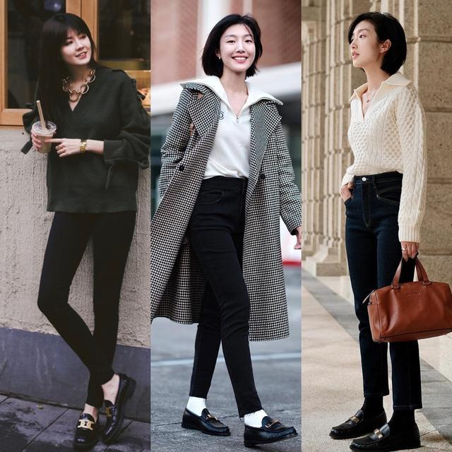 黑色乐福鞋最百搭,配黑裤子能让腿部线条延伸成一条不断的直线;棕色乐福鞋自带一股复古调调,配牛仔裤和大地色系的上衣非常协调。