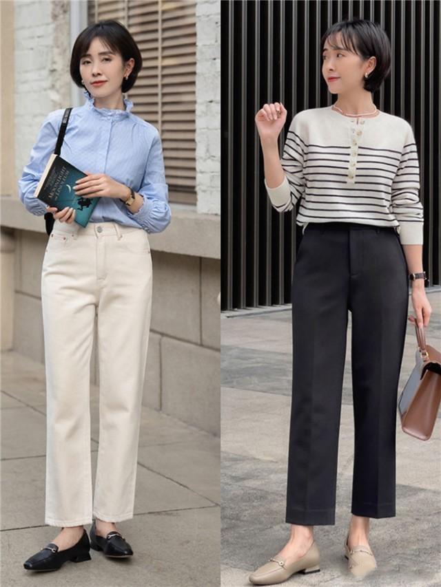 如果你腿型不算笔直,紧身裤和阔腿裤都不太适合,紧身裤会把O型腿或X型腿原封不动勾勒出来,阔腿裤裤管太宽,在九分长度上容易显得头重脚轻。