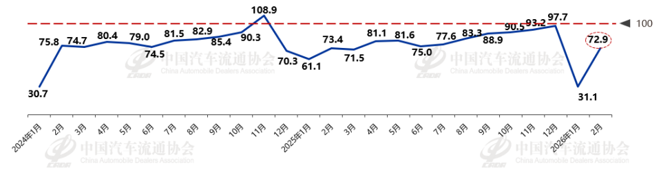 “向新”不仅是跃升的产值,更是消费者实实在在的购买力。中国汽车流通协会发布的2月汽车消费指数升至72.9,较1月明显上升,预示车市正从春节淡季的谷底稳步修复。