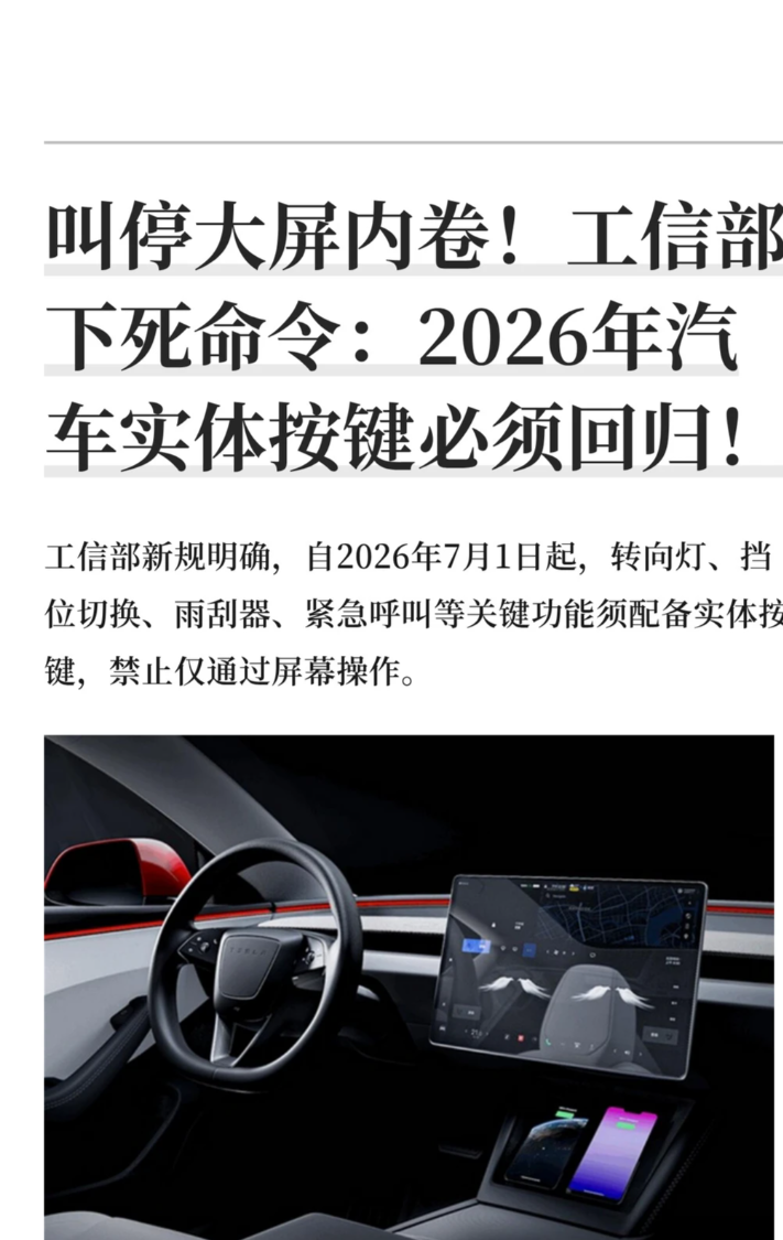 此次工信部新规的出台,直指近年来汽车内饰设计“屏幕至上、实体按键消失”的行业怪圈。自特斯拉掀起 “去实体按键” 风潮后,大屏与极简内饰一度成为车企标榜 “科技感” 的代名词,众多品牌纷纷效仿,将原本的实体按键功能悉数整合至中控大屏,甚至连空调、车窗、灯光等基础操作都需通过触控屏完成。但这种设计看似提升了科技感,却埋下了巨大的驾驶安全隐患,成为行业发展中跑偏的 “内卷狂欢”,而新规的落地,正是对这一畸形发展趋势的理性纠偏。