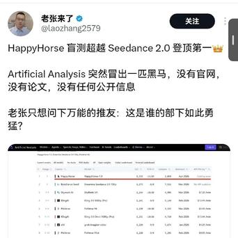 作为独立第三方评测机构,Artificial Analysis的榜单以盲测机制为核心,综合评估视频生成质量、音画同步、细节还原等多维度能力,是全球AI视频领域的重要参考。此次HappyHorse-1.0的突围,不仅打破了字节、快手等大厂对头部席位的垄断,更凸显了文生视频赛道的激烈竞争与技术迭代速度。